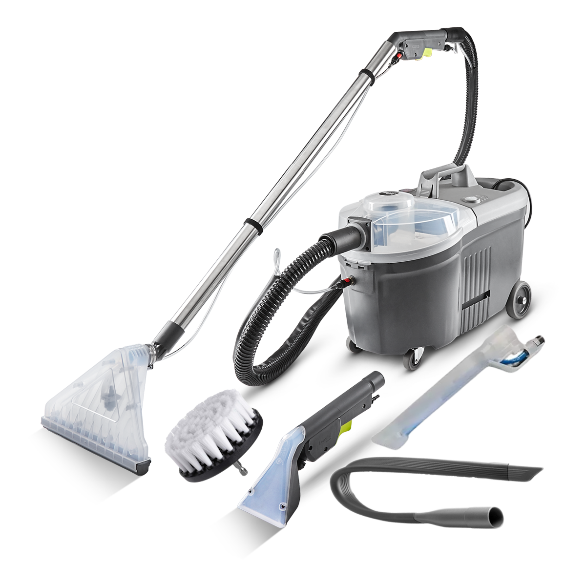 W zestawie: ssawka do prania tapicerki, ssawka z rurami do prania dywanów, ssawka szczelinowa do prania, nakładka do ściągania wody, ssawka szczelinowa giętka do trudno dostępnych miejsc, szczotka na wkrętarkę.