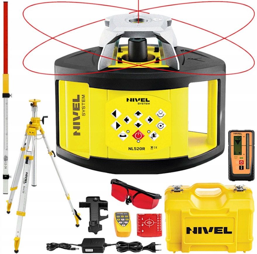 W zestawie: czujnik laserowy, uchwyt na łatę, pilot zdalnego sterowania, akumulatorki, ładowarka, okulary, tarcza, statyw, łata